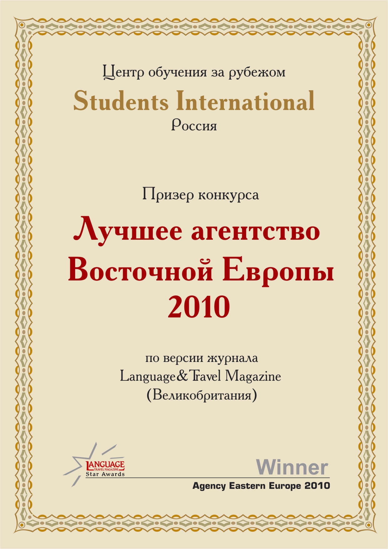 - Сертификат Победителя конкурса "Лучшее образовательное агентство Восточной Европы 2010"