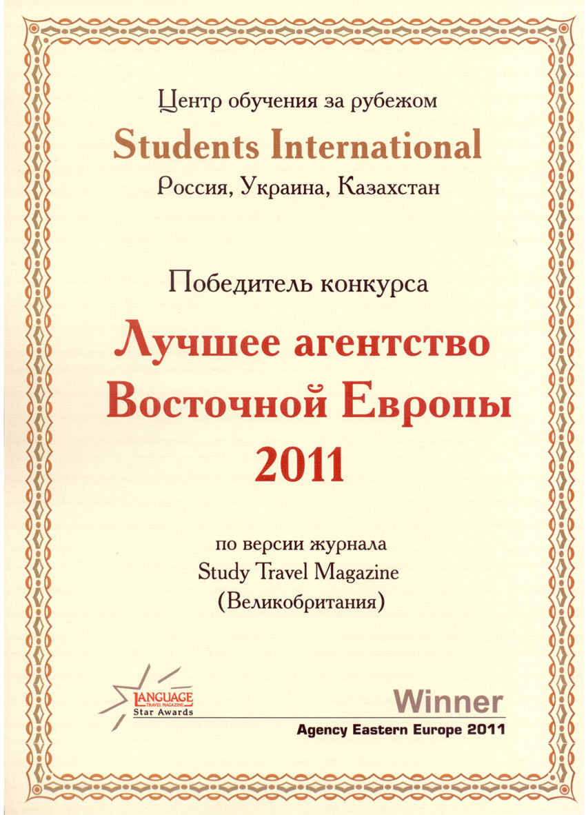 2009, 2010, 2011, 2012 и 2013 гг. – пять раз подряд мы признаны победителем в номинации "Агентство Восточной Европы" - STM Star Award (Study Travel Magazine, Великобритания).На сегодняшний день только Students International удалось получить статус "SUPERSTAR" и быть внесёнными в Зал Славы лучших образовательных учреждений и агентств мира!