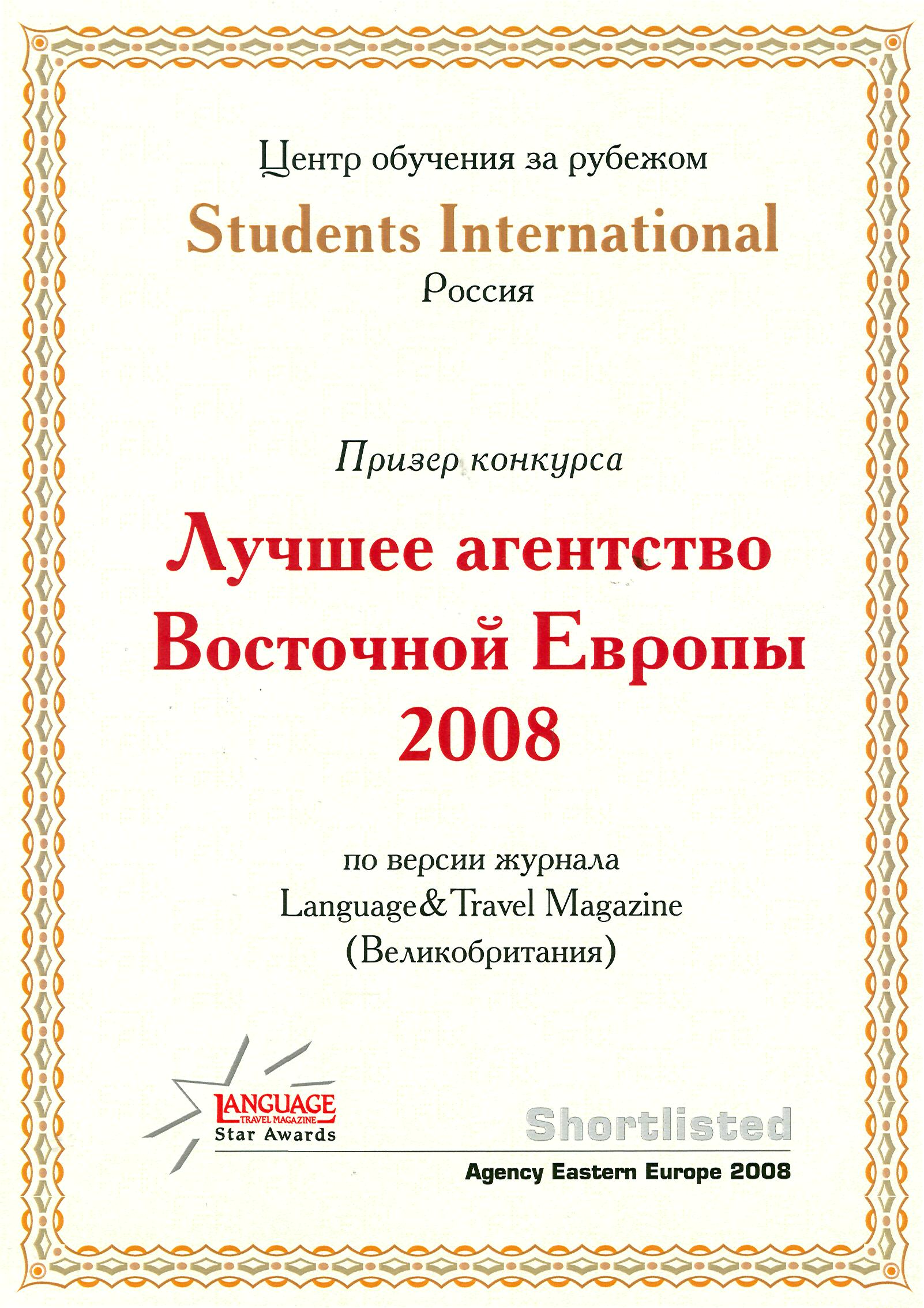 - 2008 год – Students International включен в шорт-лист лучших компаний Восточной Европы (Study Travel Magazine, Великобритания).